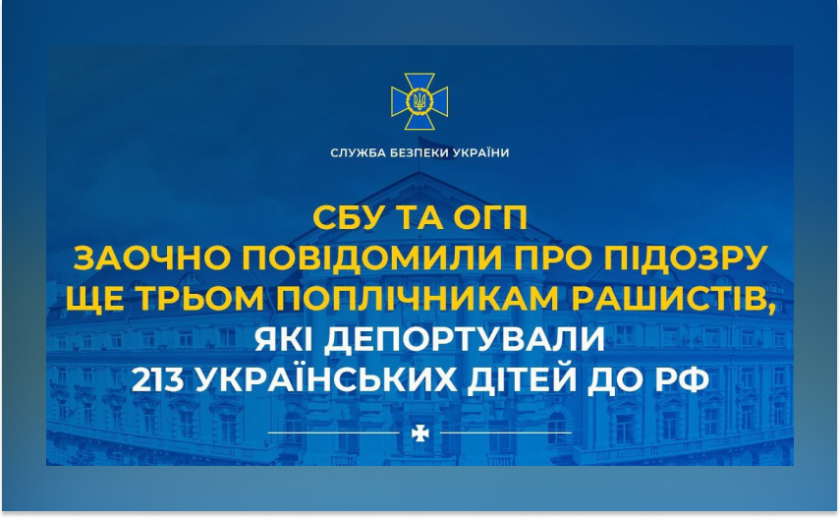 Служба безпеки України спільно з Офісом Генерального прокурора заочно повідомили про підозру трьом представникам окупаційної адміністрації рф, причетним до незаконної депортації українських дітей з тимчасово окупованої частини Донеччини.