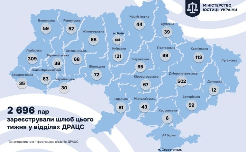 Дніпропетровщина – в лідерах за кількістю одружень pavlograd.info 05.01.2026 13:30 За минулий тиждень в Україні було зареєстровано 2 696 шлюбів.